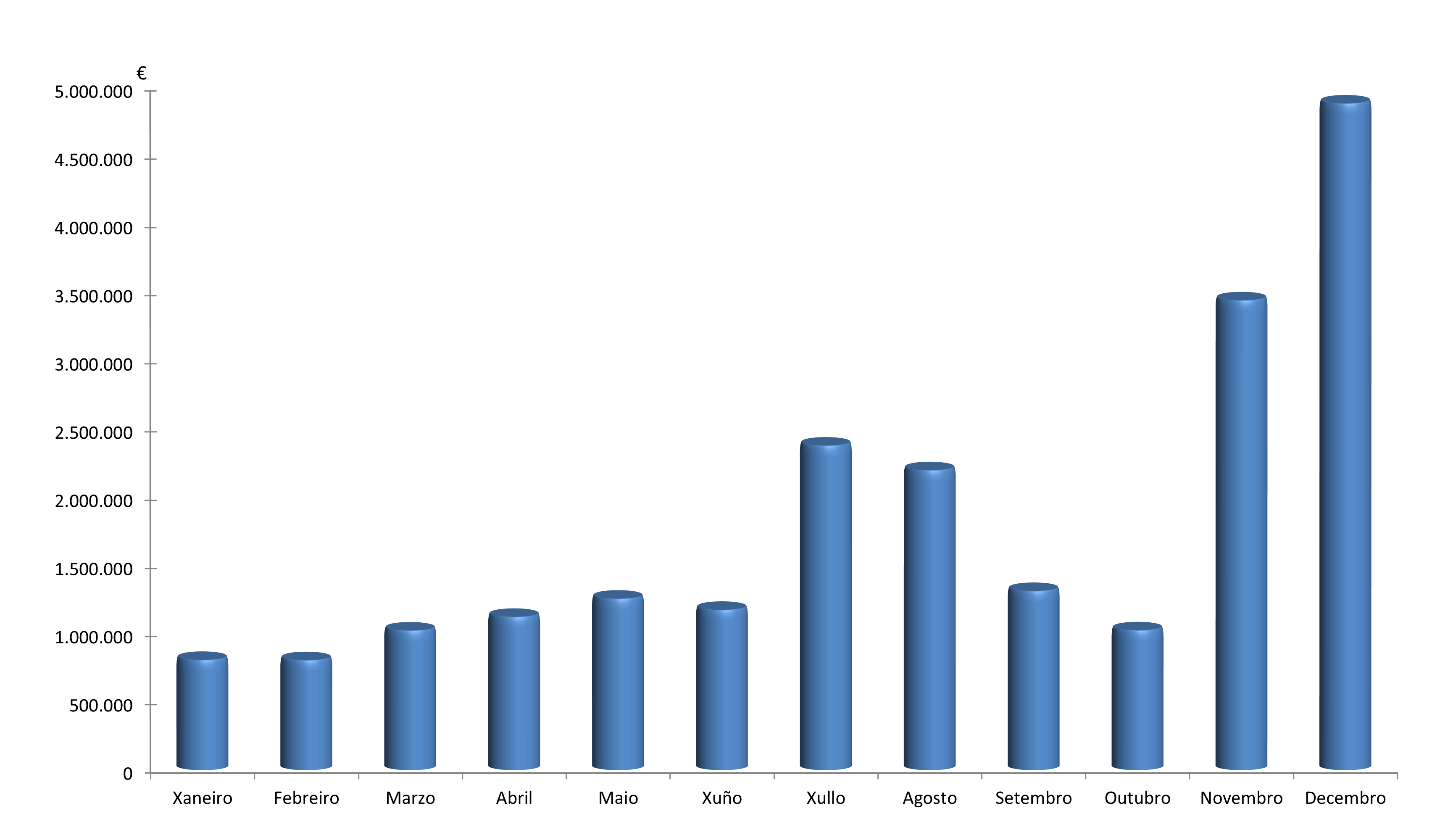 | Xaneiro | Febreiro | Marzo | Abril | Maio | Xuño | Xullo | Agosto | Setembro | Outubro | Novembro | Decembro | Total | |
