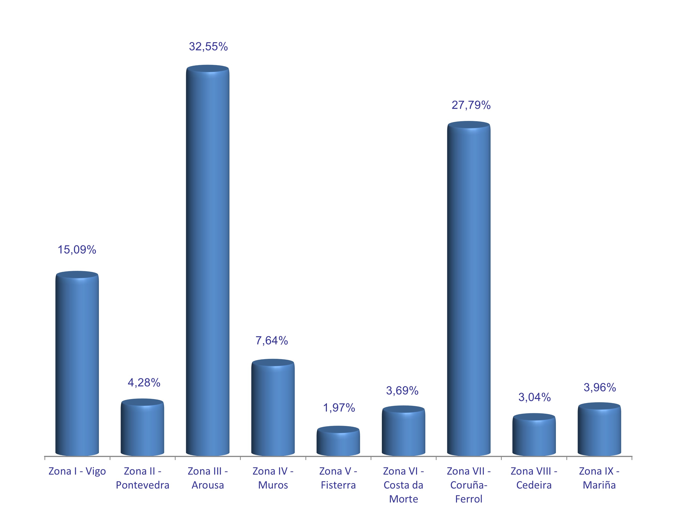 | Zona VI - Costa da Morte | 150 | 17.897 | 3,69% | 149.603 | 2,48% | 8,36 |