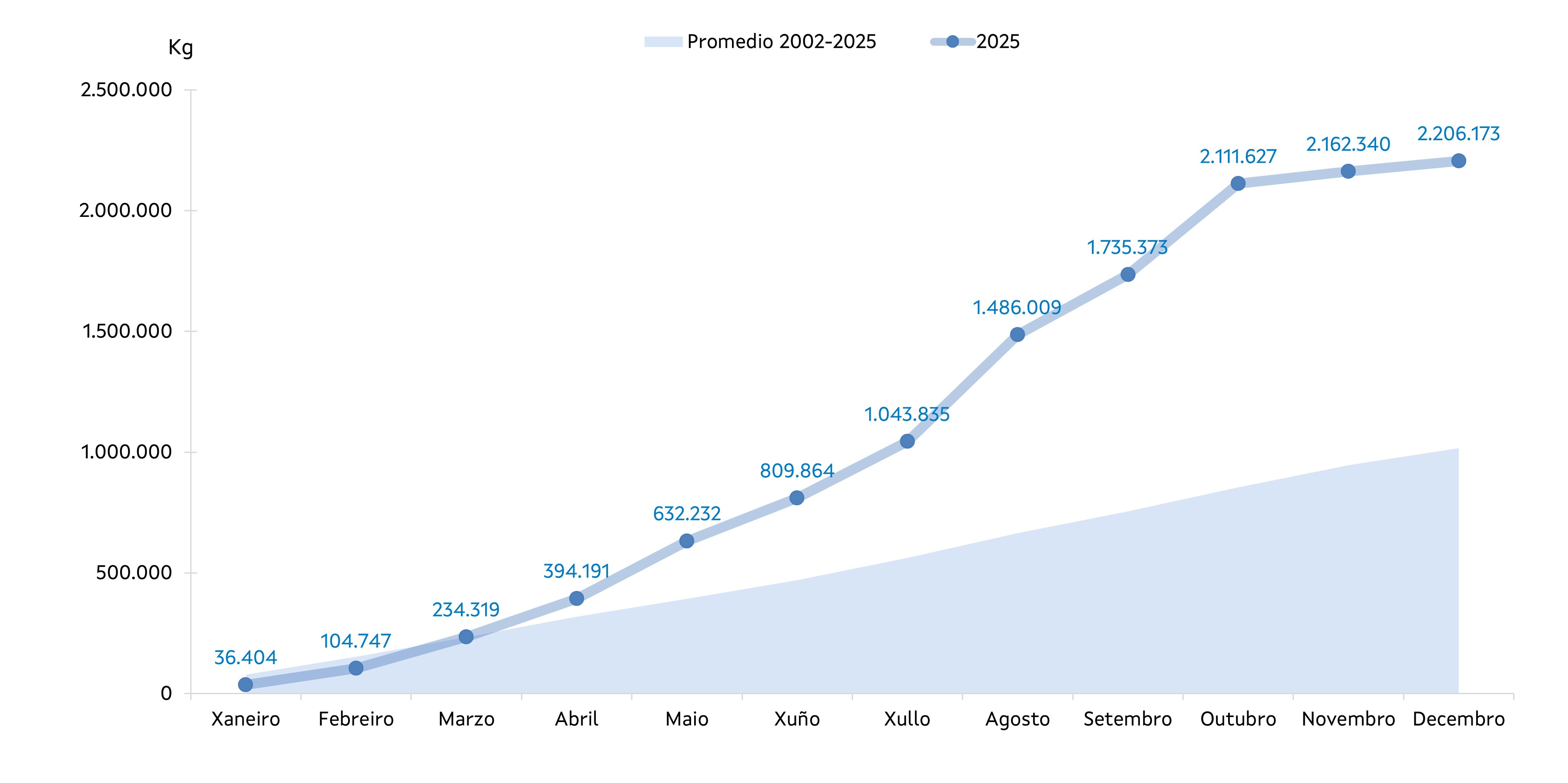 | Fisterra | 406.216 | 3.305.825 | 407.642 | 3.048.303 | -1.426 | 257.521 | -0,35% | 8,45% |
