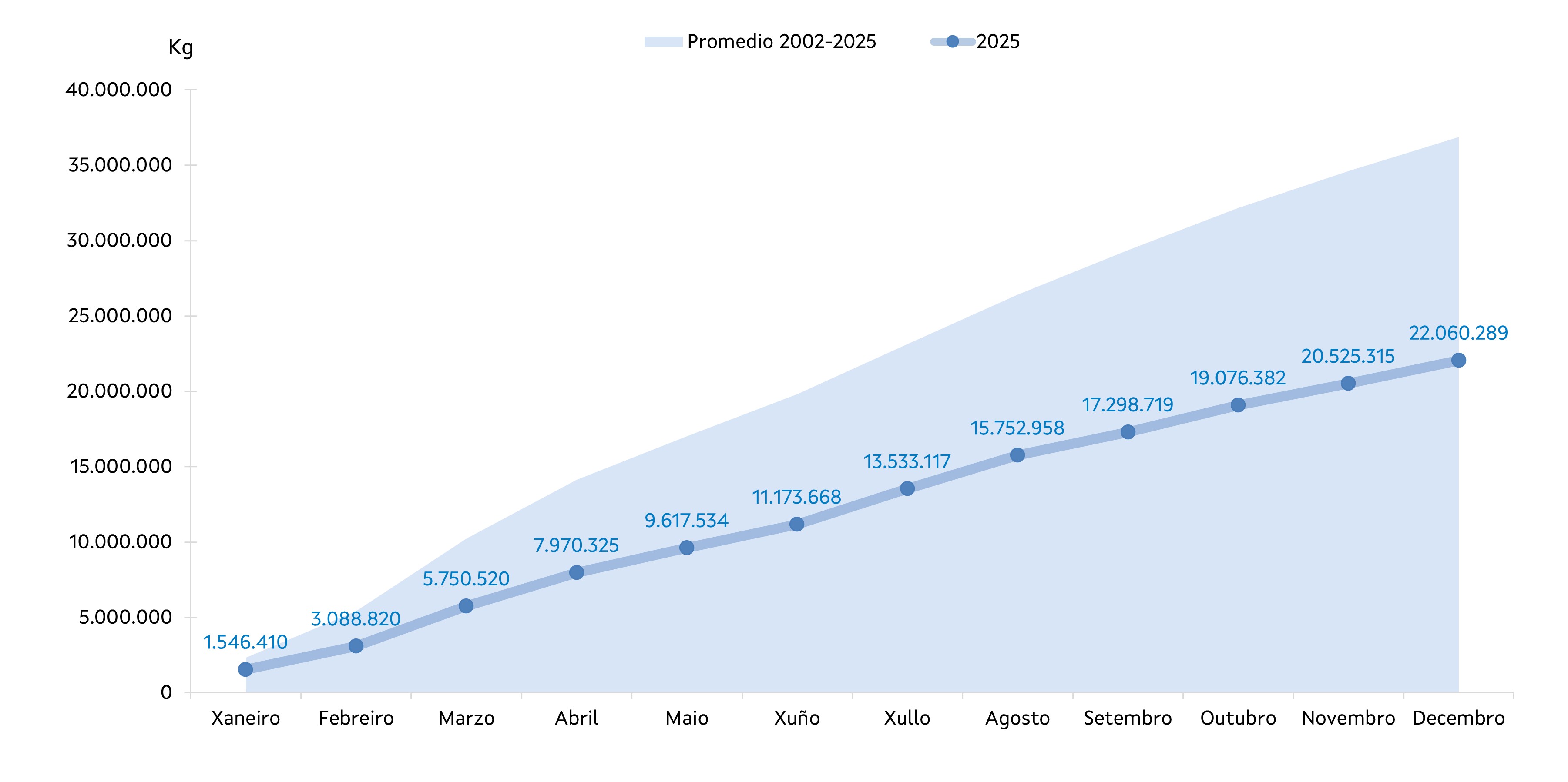| Crustáceos | 25.896 | 615.522 | 38.868 | 746.667 | -12.971 | -131.145 | -33,37% | -17,56% |