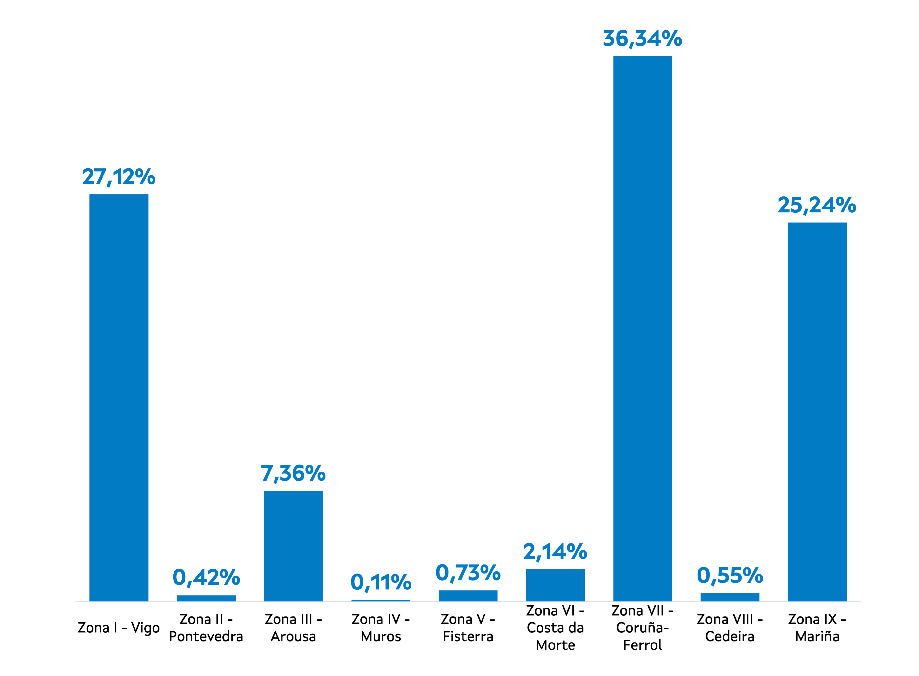 | Zona VII - Coruña-Ferrol | 254 | 471.077 | 36,34% | 1.019.482 | 38,33% | 2,16 |