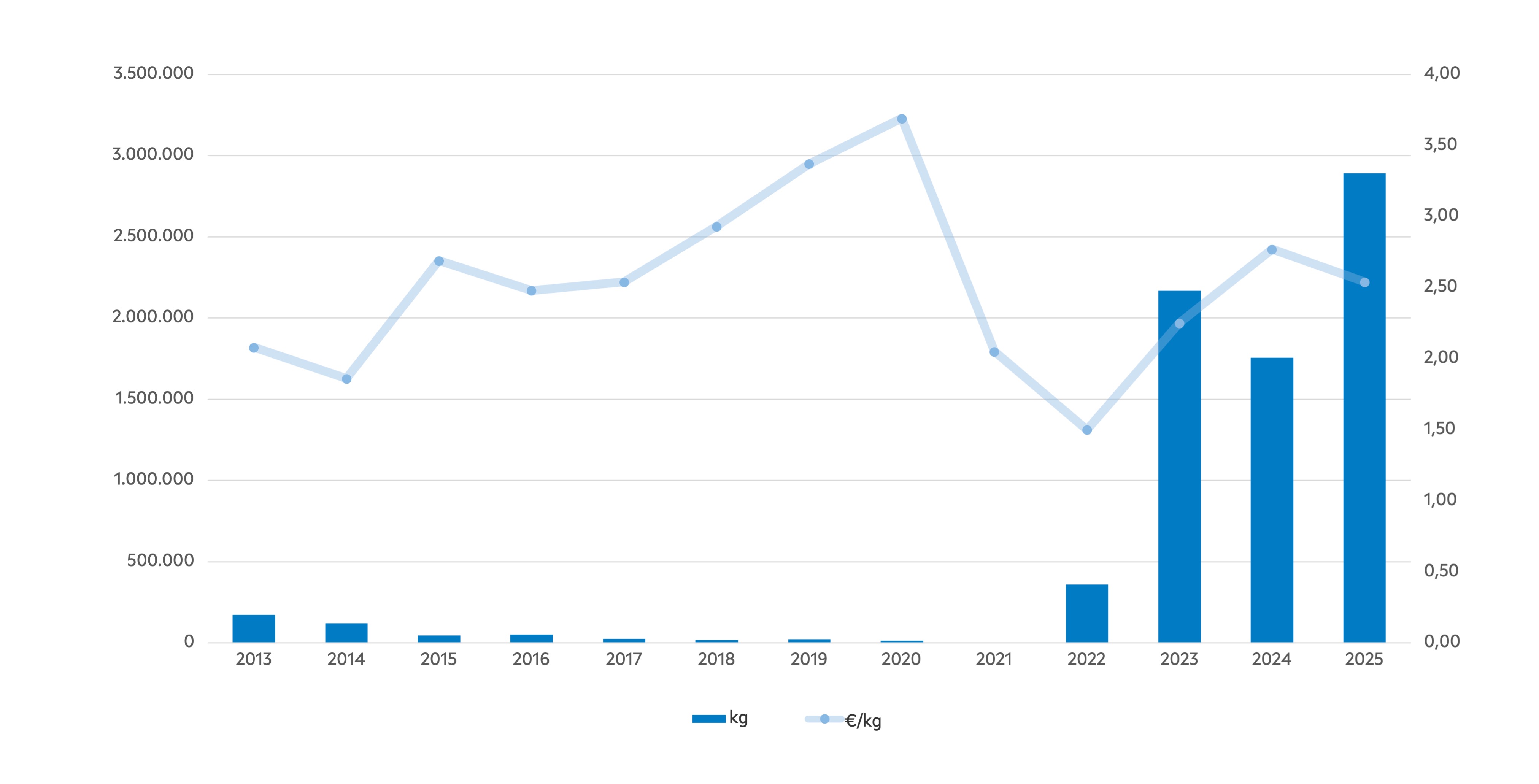 | Evolución das vendas de pota común por zona en cantidade (kg) | |||||||||||||