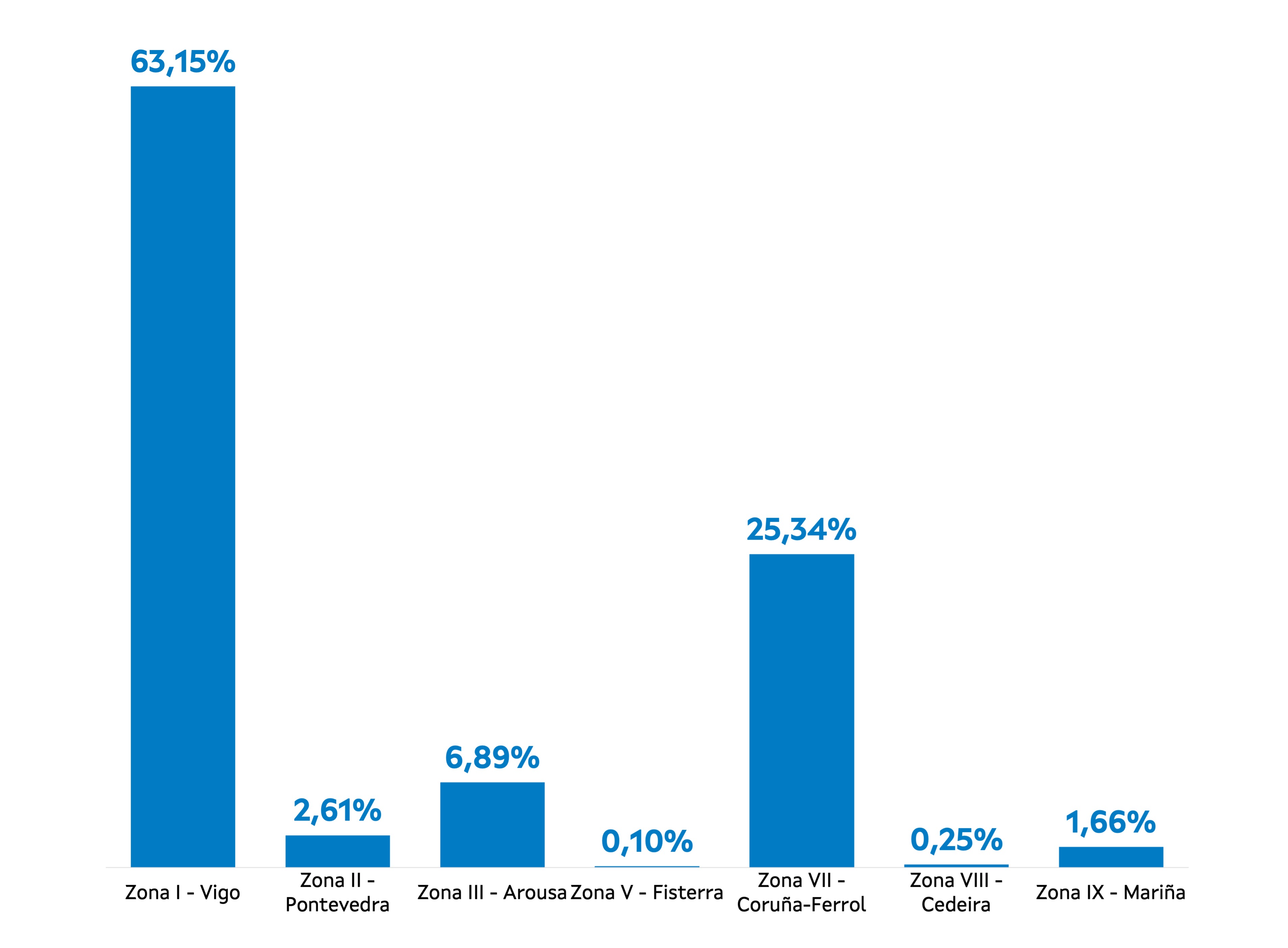 | Zona VII - Coruña-Ferrol | 245 | 301.933 | 25,34% | 1.523.078 | 24,84% | 5,04 |