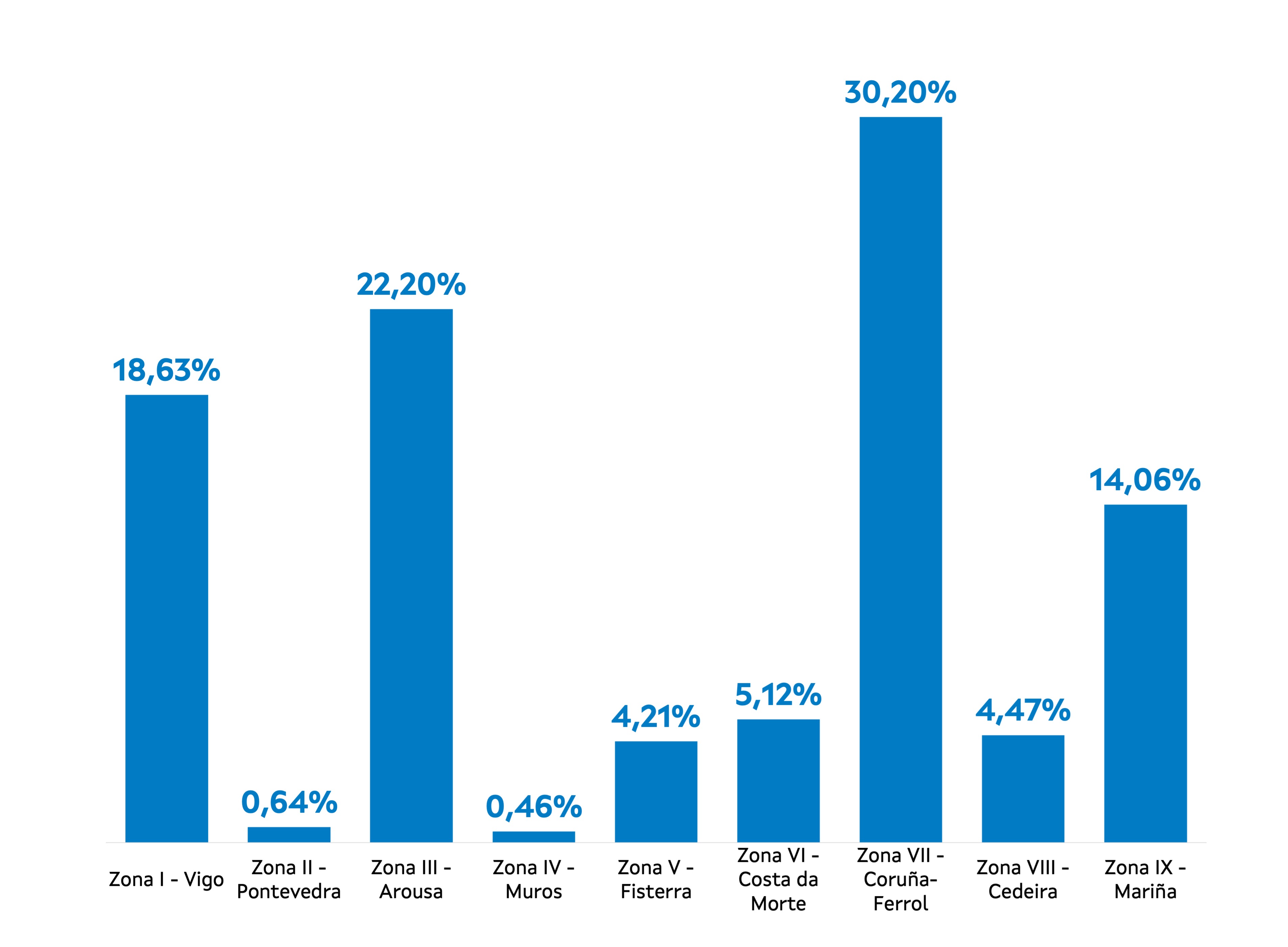 | Zona VI - Costa da Morte | 239 | 13.851 | 5,12% | 257.973 | 5,28% | 18,62 |