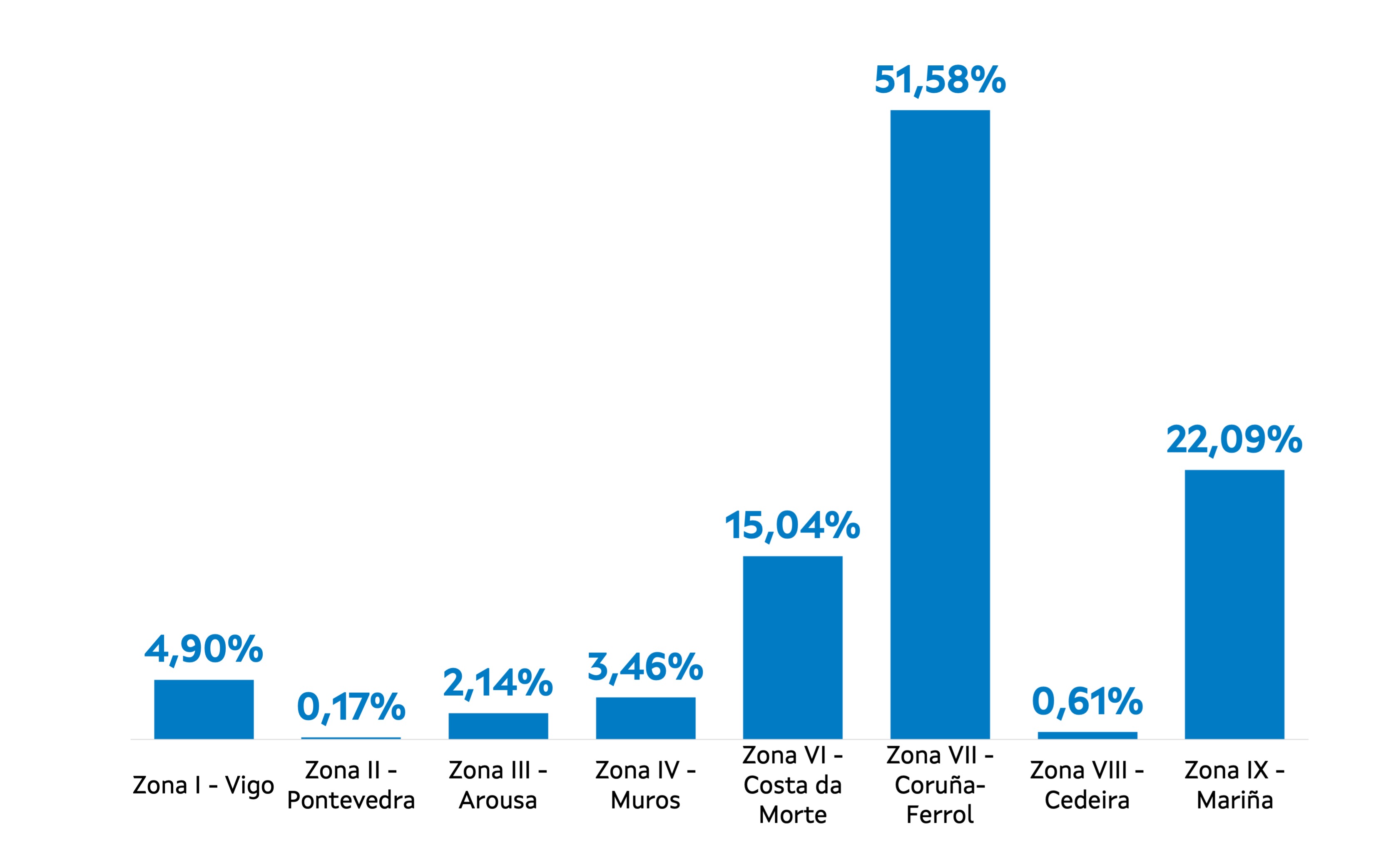 | Zona VI - Costa da Morte | 3 | 126.726 | 15,04% | 127.905 | 13,55% | 1,01 |
