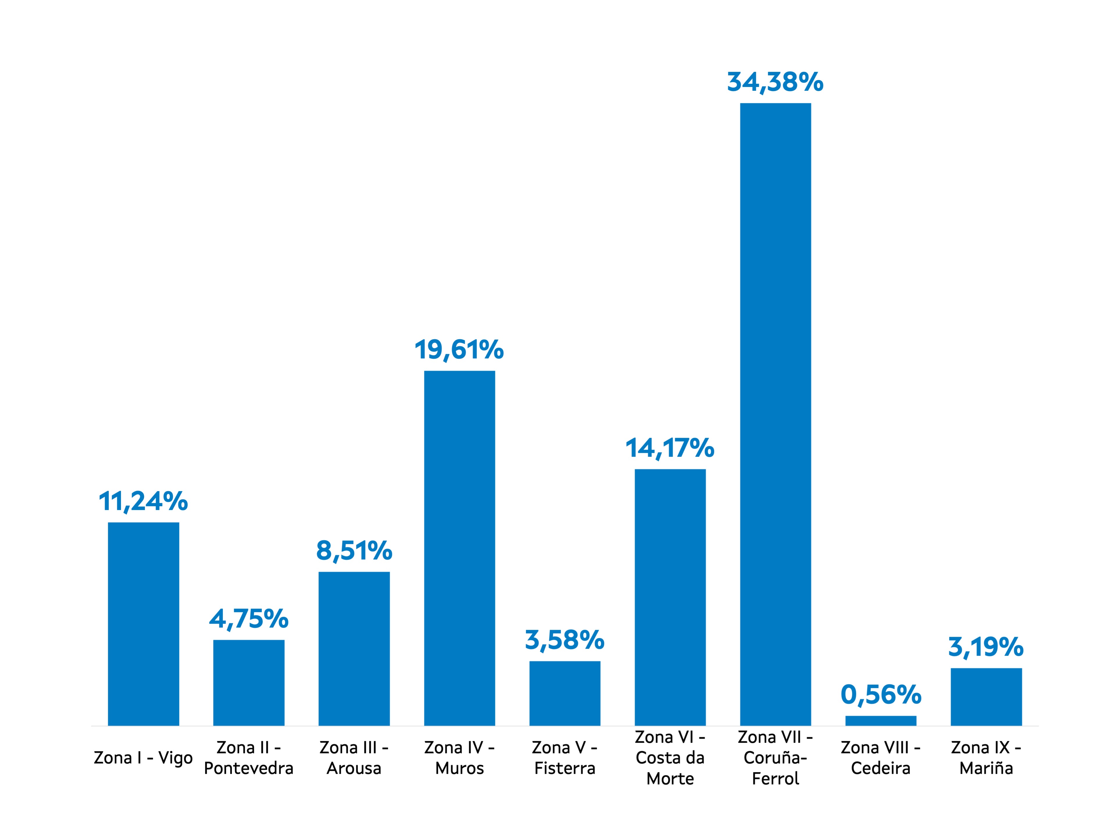 | Zona VI - Costa da Morte | 227 | 1.720.520 | 14,17% | 1.344.223 | 7,76% | 0,78 |