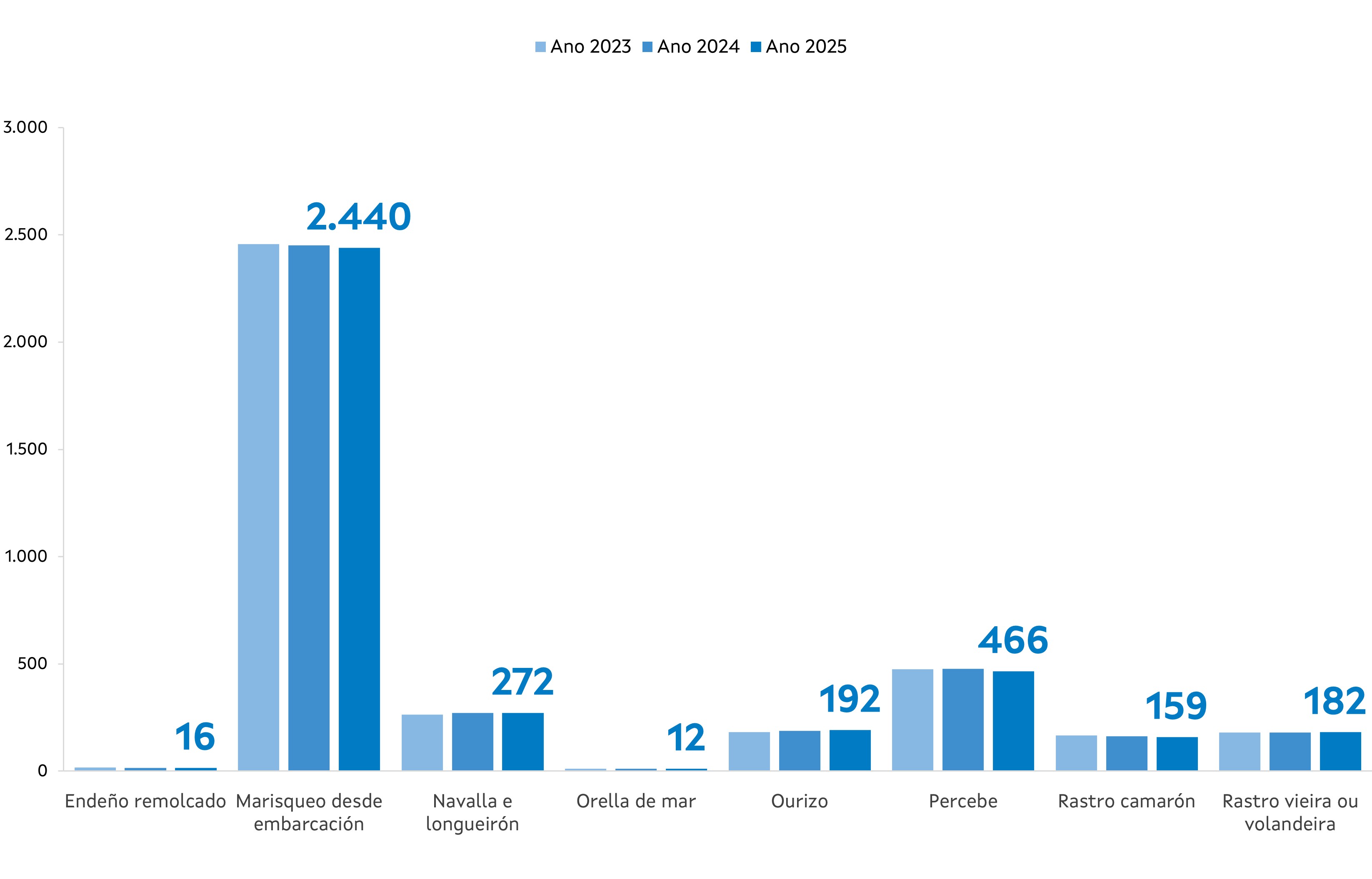 | Marisqueo desde embarcación | 2.440 | -11 | 5,69 | 0,00 | 1,32 | 0,00 | 24,08 | 0,13 |