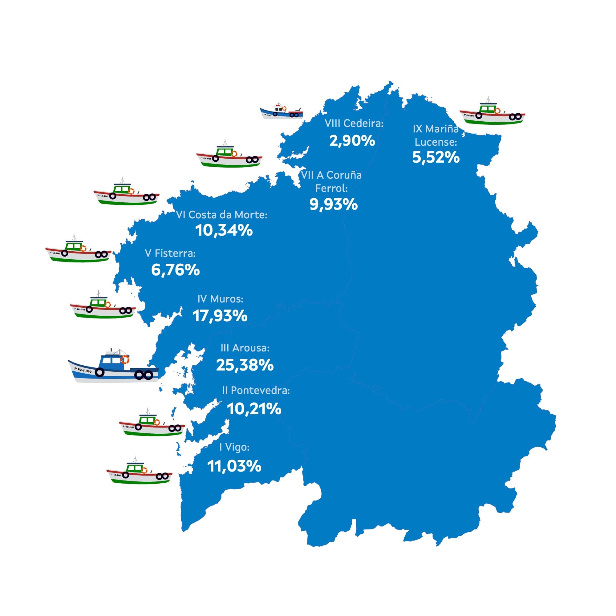 | Zona VI - Costa da Morte | 75 | 5,63% | 10,34% | 0,65% | 627 | 3,05% | 4.274 | 4,42% |