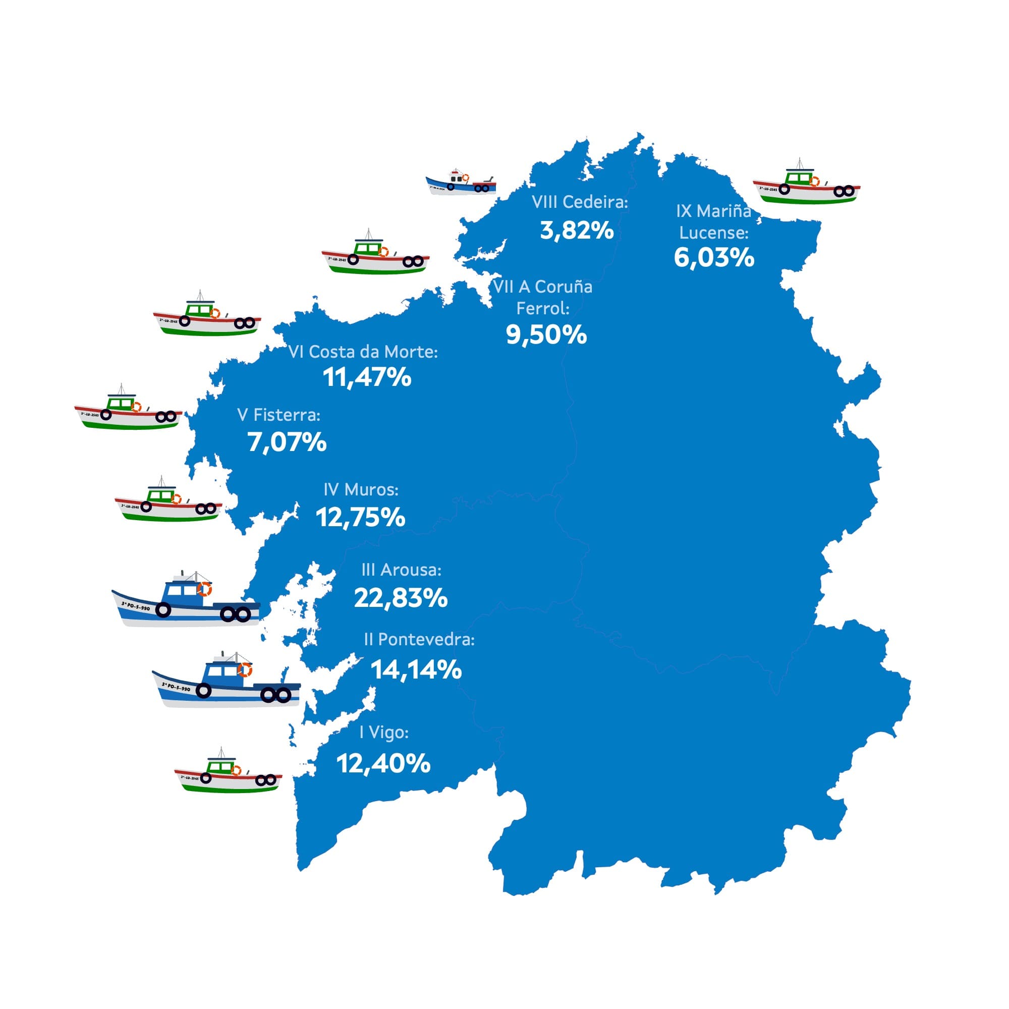 | Zona VI - Costa da Morte | 99 | 3,13% | 11,47% | 0,46% | 737 | 2,06% | 5.218 | 3,49% |