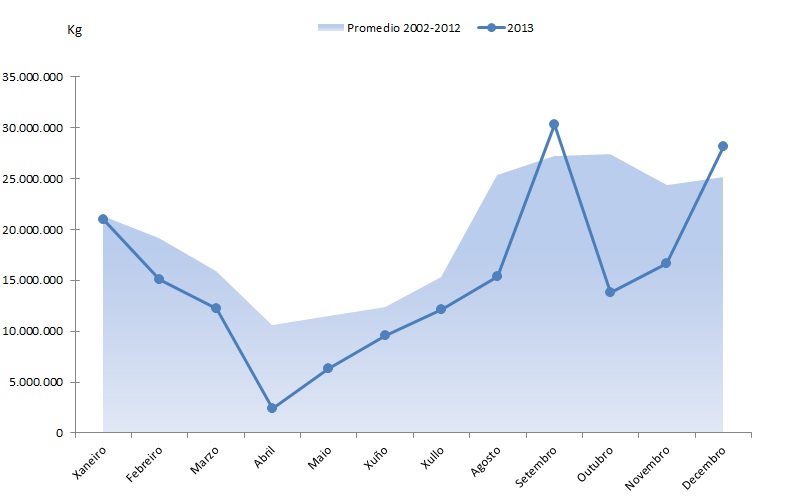 | Xuño | Cantidade (kg) | 13.548.476 | 9.159.822 | 8.614.770 | 11.993.980 | 11.569.686 | 20.284.746 | 9.097.625 | 9.598.272 | |