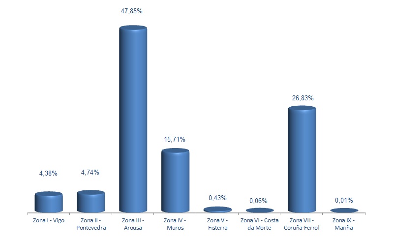 | Zona VI - Costa da Morte | 15 | 659 | 0,06% | 4.779 | 0,04% | 7,25 |