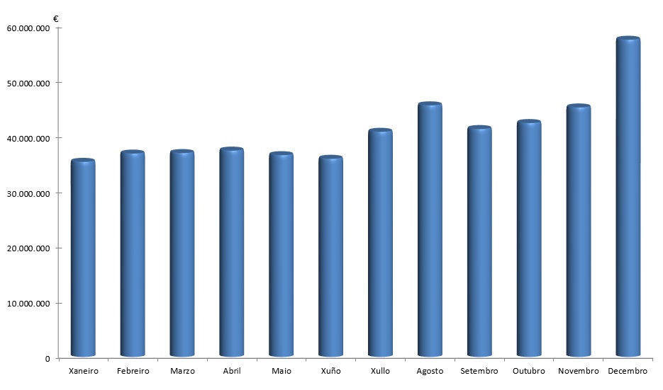 | Xaneiro | Febreiro | Marzo | Abril | Maio | Xuño | Xullo | Agosto | Setembro | Outubro | Novembro | Decembro | Total | |