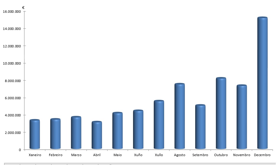 | Xaneiro | Febreiro | Marzo | Abril | Maio | Xuño | Xullo | Agosto | Setembro | Outubro | Novembro | Decembro | Total | |