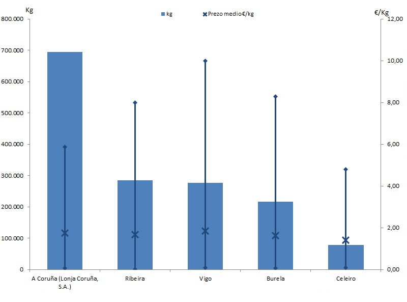 | A Coruña (Lonja Coruña, S.A.) | 276 | 694.196 | 41,78% | 1.221.475 | 42,76% | 1,76 |