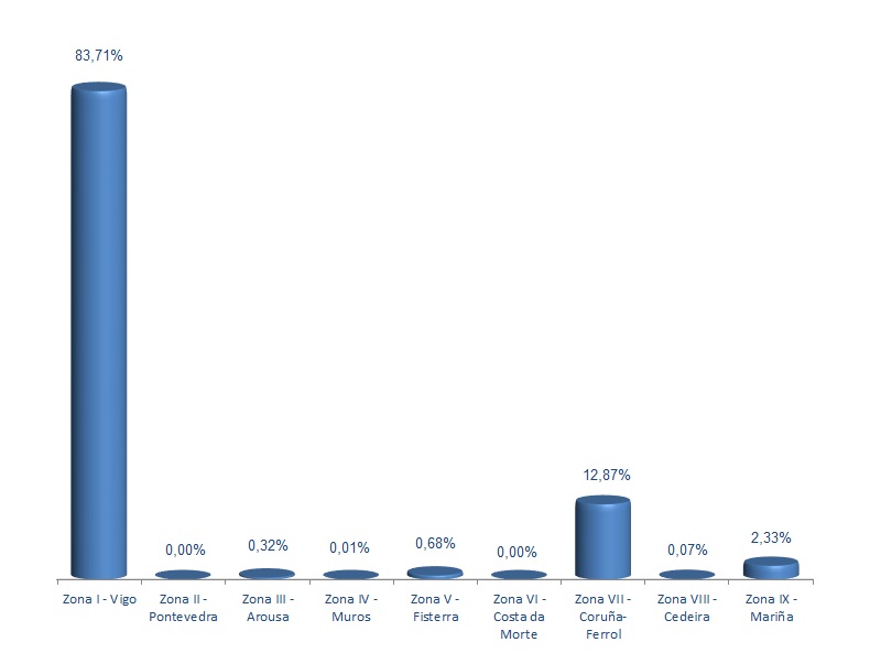 | Zona VI - Costa da Morte | 32 | 275 | 0,00% | 2.038 | 0,00% | 7,42 |