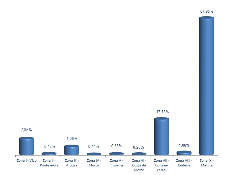 | Zona VIII - Cedeira | 235 | 383.568 | 1,08% | 1.215.603 | 0,87% | 3,17 |