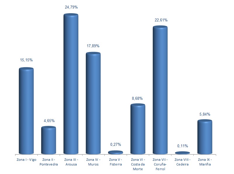 | Zona V - Fisterra | 111 | 11.877 | 0,27% | 6.566 | 0,10% | 0,55 |