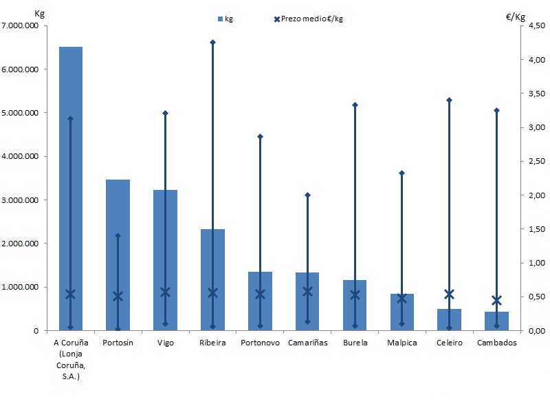 | A Coruña (Lonja Coruña, S.A.) | 191 | 6.517.893 | 28,80% | 3.528.831 | 28,64% | 0,54 |