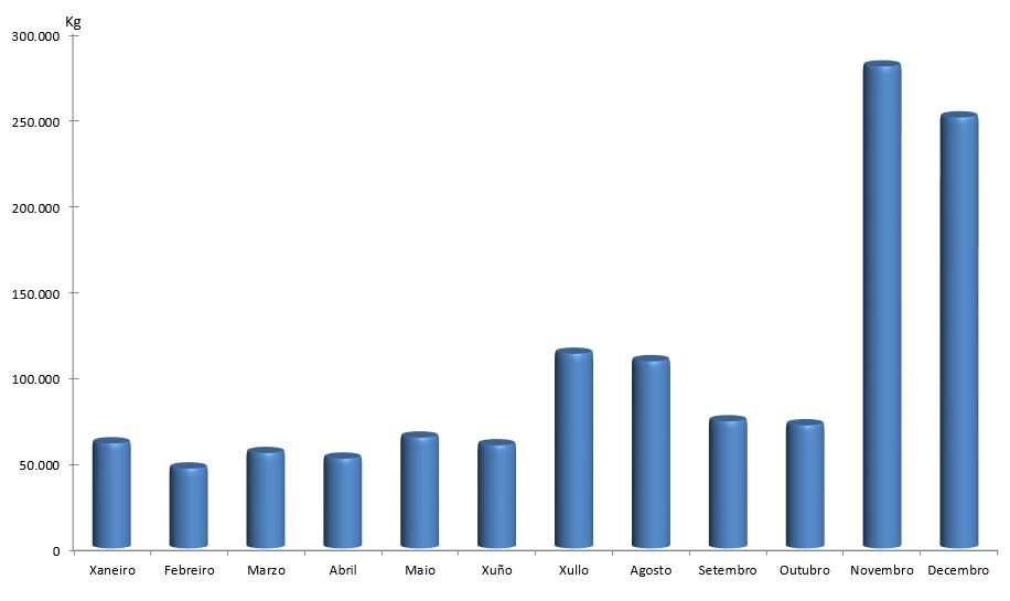 | Percebe | 17.620 | 12.989 | 20.674 | 27.870 | 33.819 | 33.334 | 45.673 | 50.281 | 25.474 | 19.228 | 20.963 | 35.568 | 343.493 |