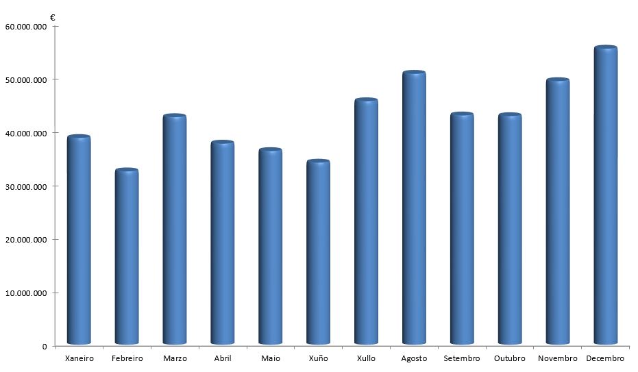 | Xaneiro | Febreiro | Marzo | Abril | Maio | Xuño | Xullo | Agosto | Setembro | Outubro | Novembro | Decembro | Total | |