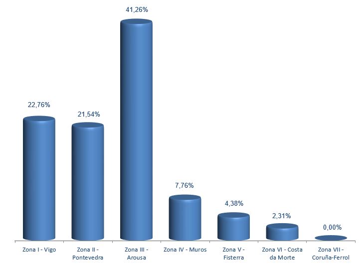 | Zona VI - Costa da Morte | 102 | 13.063 | 2,31% | 103.912 | 1,88% | 7,95 |