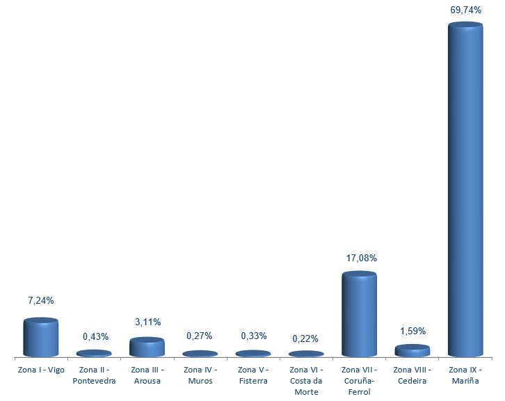| Zona VI - Costa da Morte | 248 | 72.403 | 0,22% | 244.518 | 0,17% | 3,38 |