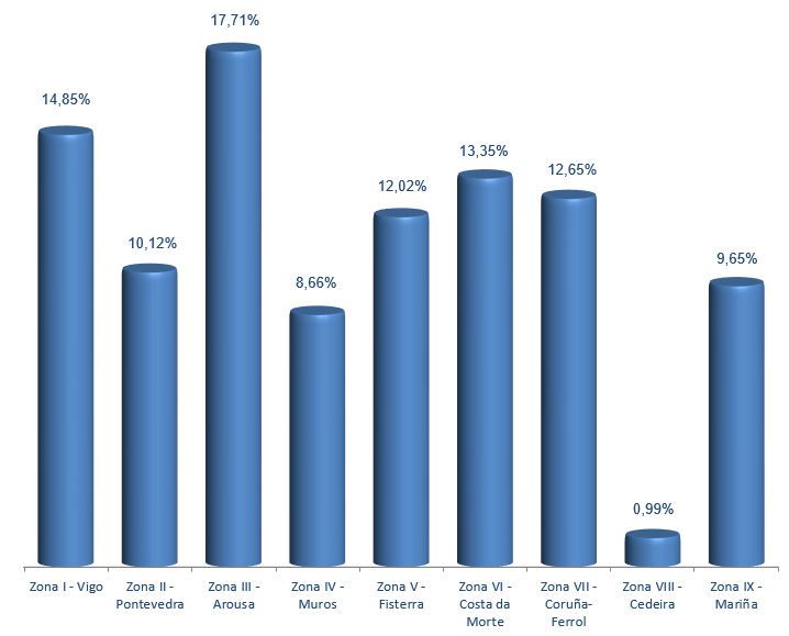 | Zona VI - Costa da Morte | 223 | 271.031 | 13,35% | 2.093.461 | 13,15% | 7,72 |