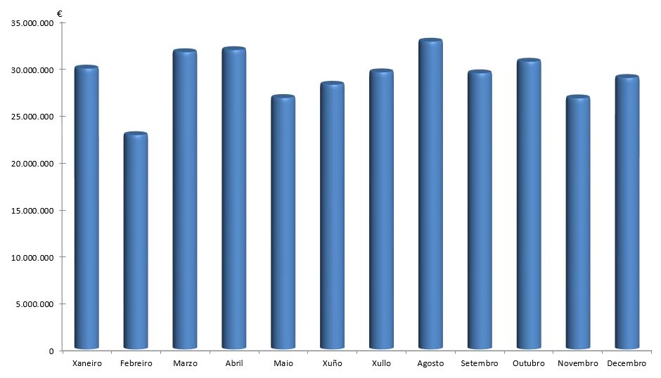 | Xaneiro | Febreiro | Marzo | Abril | Maio | Xuño | Xullo | Agosto | Setembro | Outubro | Novembro | Decembro | Total | |