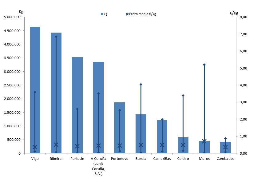 | A Coruña (Lonja Coruña, S.A.) | 220 | 3.340.944 | 14,30% | 1.527.632 | 14,68% | 0,46 |