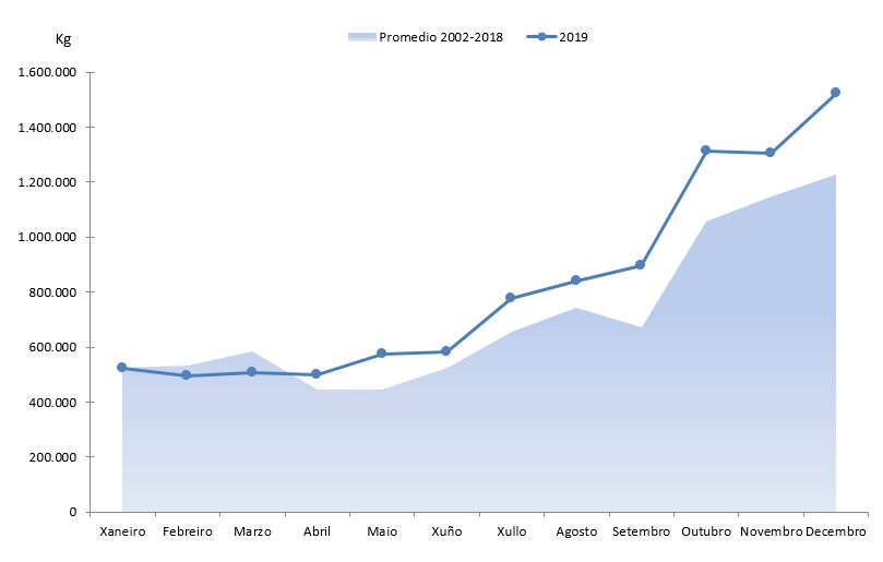 | Xaneiro | 523.704 | 4.273.373 | 593.518 | 4.681.296 | -69.814 | -407.922 | -11,76% | -8,71% |