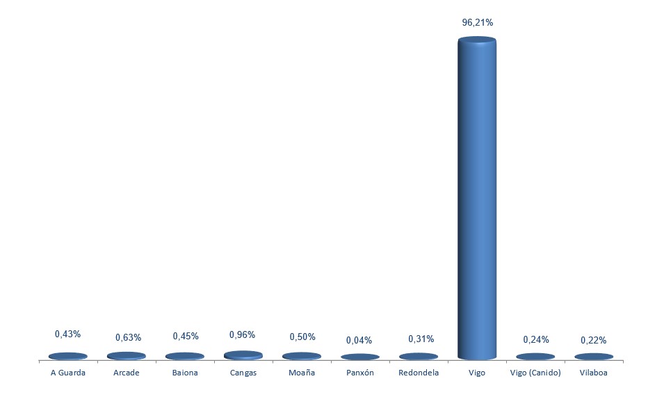 | Cangas | 337.640 | 0,96% | 3.873.439 | 3,23% | 11,47 |