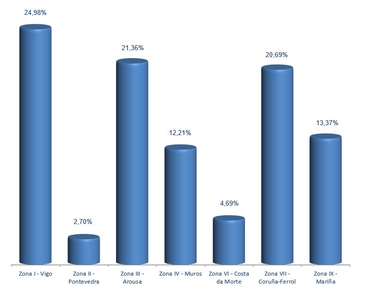 | Zona II - Pontevedra | 34 | 46.848 | 2,70% | 102.809 | 2,75% | 2,19 |