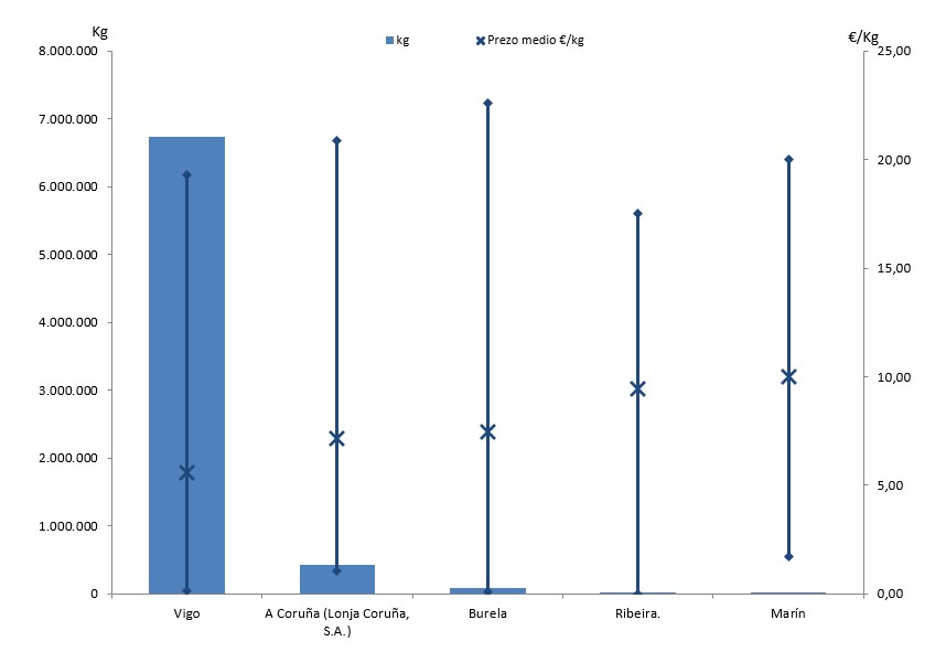 | A Coruña (Lonja Coruña, S.A.) | 284 | 430.934 | 5,89% | 3.084.309 | 7,39% | 7,16 |