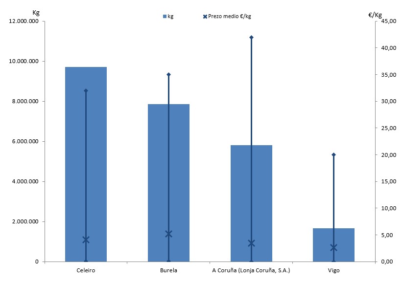 | A Coruña (Lonja Coruña, S.A.) | 306 | 5.816.227 | 21,21% | 20.283.039 | 18,09% | 3,49 |