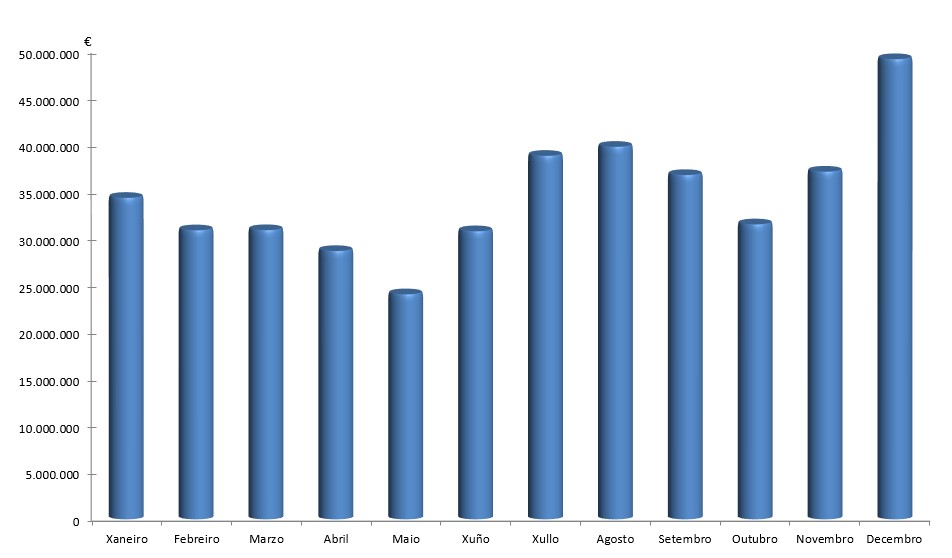 | Xaneiro | Febreiro | Marzo | Abril | Maio | Xuño | Xullo | Agosto | Setembro | Outubro | Novembro | Decembro | Total | |