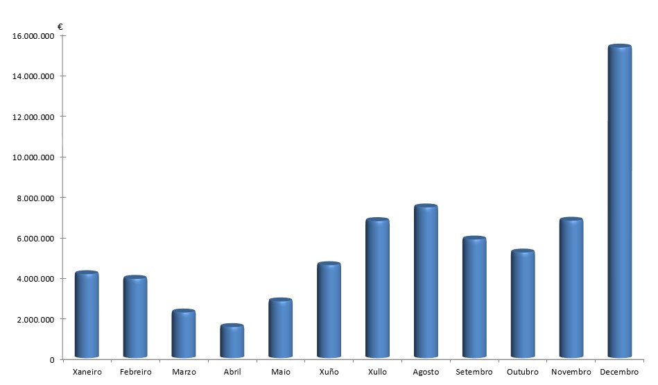 | Xaneiro | Febreiro | Marzo | Abril | Maio | Xuño | Xullo | Agosto | Setembro | Outubro | Novembro | Decembro | Total | |