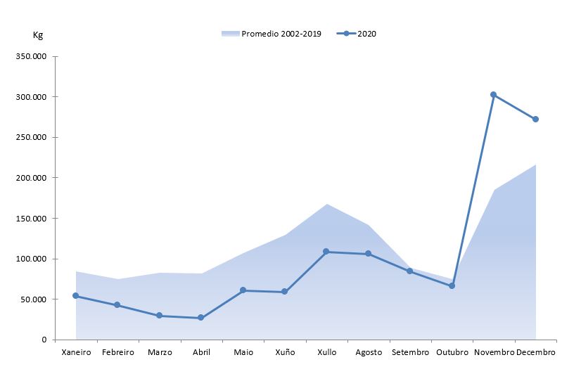 | Xuño | 58.866 | 1.050.744 | 86.218 | 1.415.906 | -27.352 | -365.163 | -31,72% | -25,79% |
