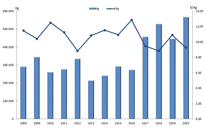 | Zona VIII - Cedeira | 2.916 | 1.224 | 1.670 | 1.367 | 1.335 | 1.560 | 2.457 | 3.410 | 5.497 | 6.929 | 8.437 | 9.217 | 7.479 |