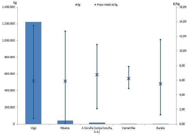| A Coruña (Lonja Coruña, S.A.) | 88 | 18.429 | 1,43% | 124.574 | 1,62% | 6,76 |