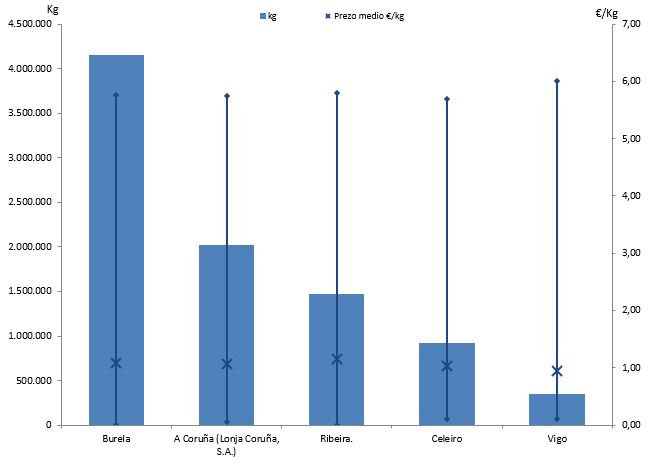 | A Coruña (Lonja Coruña, S.A.) | 249 | 2.026.197 | 20,67% | 2.156.932 | 20,15% | 1,06 |