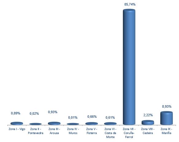 | Zona VI - Costa da Morte | 170 | 6.820 | 0,61% | 33.881 | 0,56% | 4,97 |