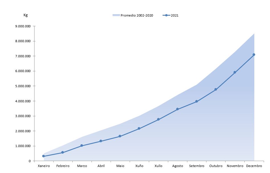 | Ostra rizada | 98.713 | 111.768 | 71.324 | 81.298 | 27.389 | 30.470 | 38,40% | 37,48% |