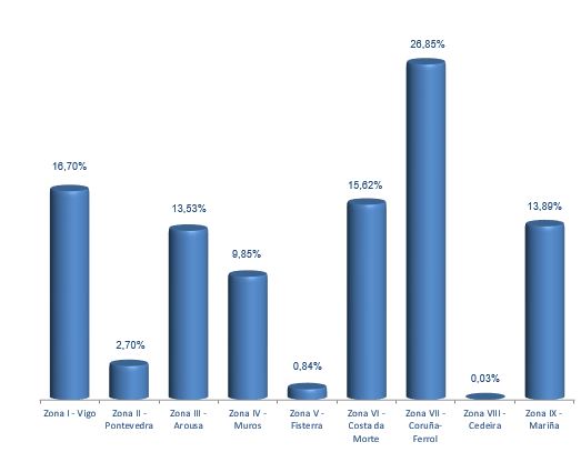 | Zona VI - Costa da Morte | 117 | 327.759 | 15,62% | 144.612 | 15,24% | 0,44 |
