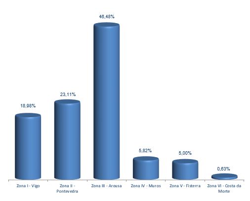 | Zona VI - Costa da Morte | 80 | 3.306 | 0,63% | 31.245 | 0,50% | 9,45 |