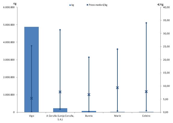 | A Coruña (Lonja Coruña, S.A.) | 285 | 229.705 | 4,39% | 1.768.721 | 6,15% | 7,70 |