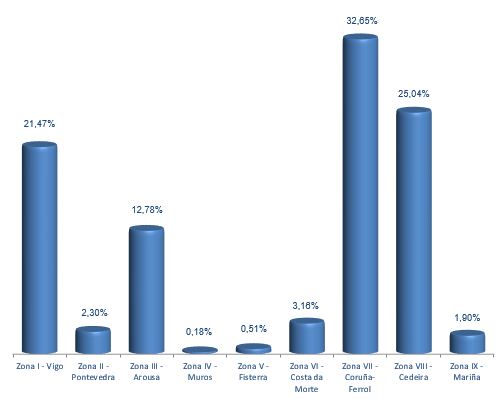 | Zona VIII - Cedeira | 215 | 63.623 | 25,04% | 1.978.699 | 22,46% | 31,10 |