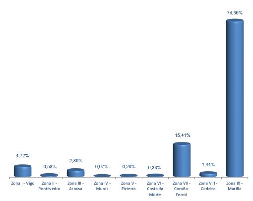 | Zona VIII - Cedeira | 244 | 361.113 | 1,44% | 1.393.551 | 1,36% | 3,86 |