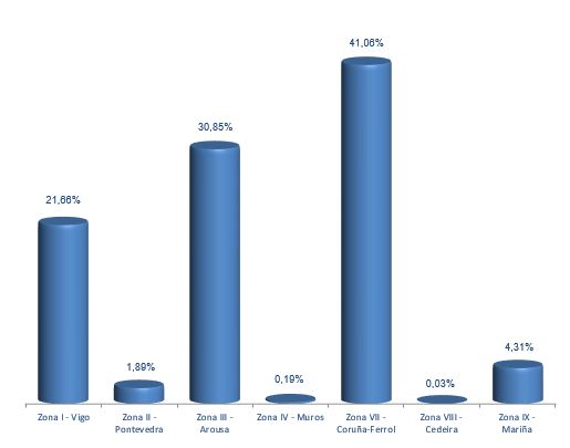 | Zona II - Pontevedra | 232 | 70.442 | 1,89% | 193.896 | 3,19% | 2,75 |