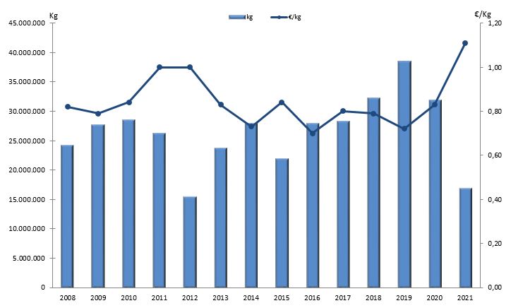 | Zona II - Pontevedra | 608.517 | 428.142 | 430.288 | 503.595 | 872.699 | 661.021 | 785.524 | 690.135 | 1.225.564 | 1.173.728 | 1.110.290 | 639.565 | 343.041 |