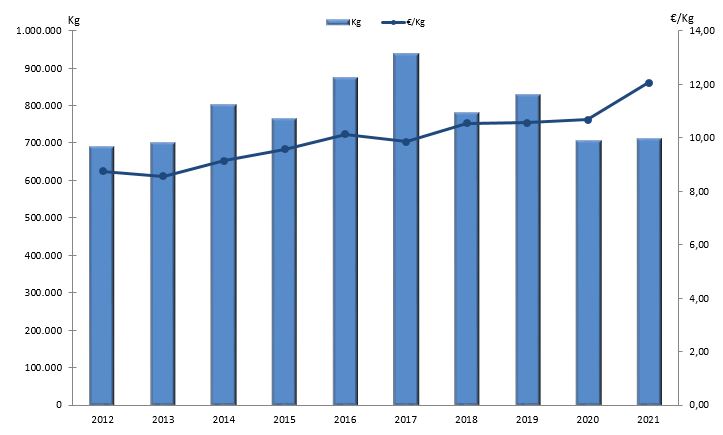| Centola ou centolo | 153 | 88.999 | 12,51% | 1.258.379 | 14,68% | 14,14 |